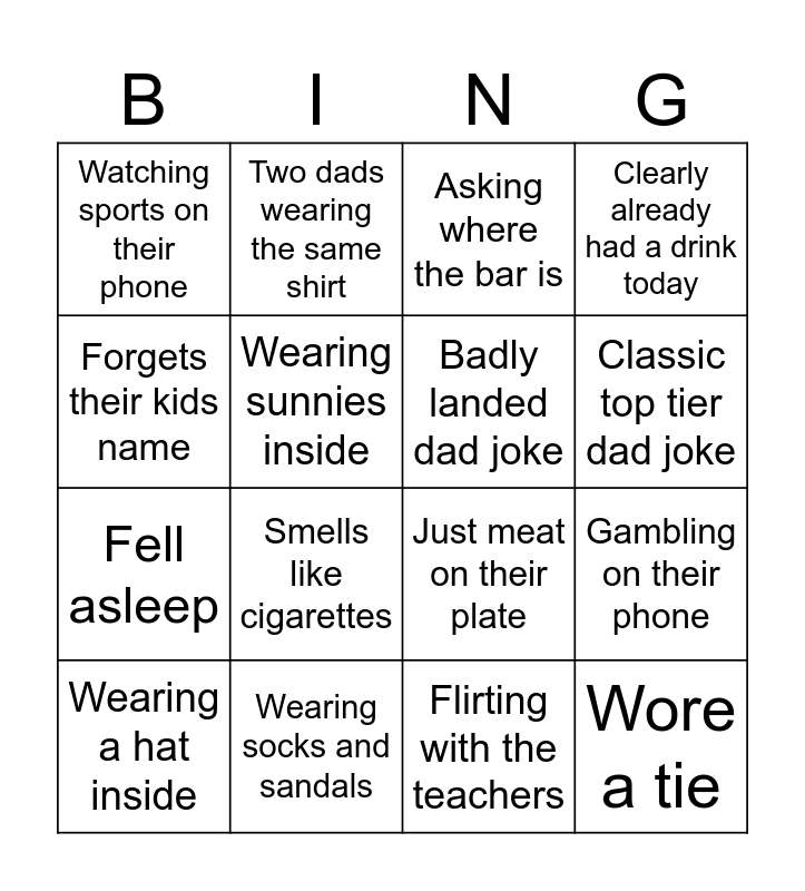 This bingo card has 16 words: Wearing socks and sandals, Gambling on their phone, Asking where the bar is, Watching sports on their phone, Fell asleep, Two dads wearing the same shirt, Just meat on their plate, Flirting with the teachers, Forgets their kids name, Wearing sunnies inside, Wearing a hat inside, Clearly already had a drink today, Smells like cigarettes, Classic top tier dad joke, Badly landed dad joke and Wore a tie.