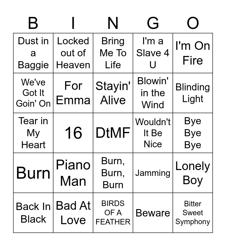 This bingo card has 50 words: Sorry I'm Here For Someone Else, DtMF, First Date, BIRDS OF A FEATHER, Piano Man, Rock That Body, Locked out of Heaven, And I Love Her, We've Got It Goin' On, Brass Monkey, For Emma, I'm a Slave 4 U, Lonely Boy, Jamming, Kilby Girl, So Good, Stayin' Alive, Wouldn't It Be Nice, Paranoid, I'm On Fire, 16, Beware, Dust in a Baggie, Blowin' in the Wind, Borderline, Bitter Sweet Symphony, Blinding Light, Sugar Suga, Bring Me To Life, Burn, Burn, Burn, Bad Habits, Broadway Girls, Black Hole Sun, Black, Bad At Love, Blurred Lines, Beauty And A Beat, Bohemian Rhapsody, More Than A Feeling, Bye Bye Bye, Black Beatles, Paranoid, Dosed, Welcome to the Black Parade, Back In Black, Tear in My Heart, Run This Town, Can't Feel My Face, Burn and Breaking the Habit.