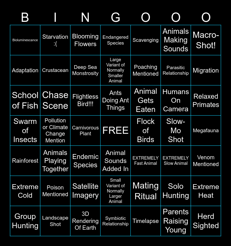 This bingo card has a free space and 48 words: Mating Ritual, Parasitic Relationship, Symbiotic Relationship, Pollution or Climate Change Mention, Flightless Bird!!!, Megafauna, Starvation :(, Landscape Shot, Animals Making Sounds, Animal Sounds Added In, Macro-Shot!, Endangered Species, Humans On Camera, Animal Gets Eaten, Extreme Cold, Slow-Mo Shot, Adaptation, Migration, Solo Hunting, Scavenging, Poaching Mentioned, Carnivorous Plant, Bioluminescance, Crustacean, Extreme Heat, Deep Sea Monstrosity, Relaxed Primates, Group Hunting, Ants Doing Ant Things, Chase Scene, Parents Raising Young, Flock of Birds, Venom Mentioned, Poison Mentioned, Swarm of Insects, EXTREMELY Fast Animal, EXTREMELY Slow Animal, School of Fish, Endemic Species, Satellite Imagery, Rainforest, Herd Sighted, Blooming Flowers, 3D Rendering Of Earth, Large Variant of Normally Smaller Animal, Small Variant of Normally Larger Animal, Animals Playing Together and Timelapse.
