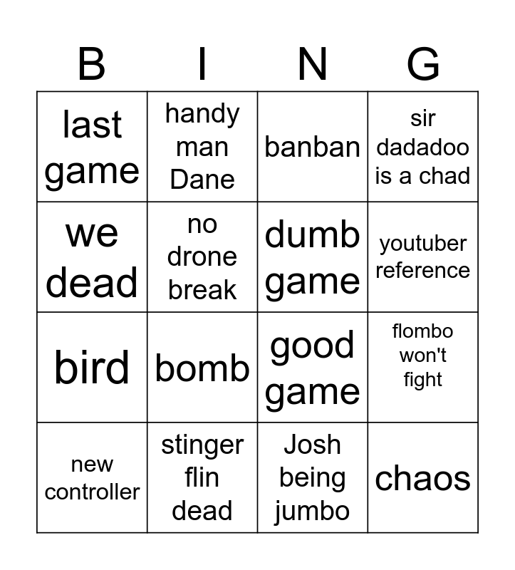 This bingo card has 16 words: stinger flin dead, flombo won't fight, banban, last game, bird, handy man Dane, good game, Josh being jumbo, we dead, no drone break, new controller, sir dadadoo is a chad, bomb, youtuber reference, dumb game and chaos.