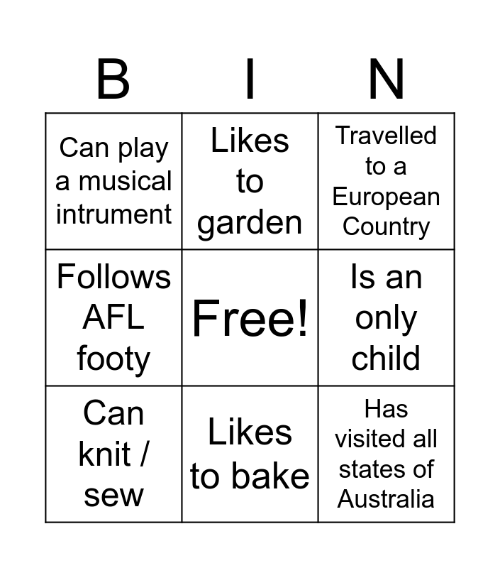 This bingo card has a free space and 8 words: Is an only child, Travelled to a European Country, Likes to garden, Can knit / sew, Can play a musical intrument, Has visited all states of Australia, Follows AFL footy and Likes to bake.