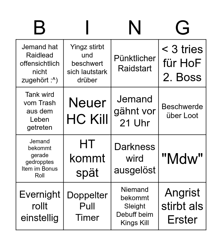 This bingo card has 16 words: Doppelter Pull Timer, "Mdw", Pünktlicher Raidstart, Jemand hat Raidlead offensichtlich nicht zugehört :^), Jemand bekommt gerade gedropptes Item im Bonus Roll, Yingz stirbt und beschwert sich lautstark drüber, Darkness wird ausgelöst, Niemand bekommt Sleight Debuff beim Kings Kill, Tank wird vom Trash aus dem Leben getreten, Neuer HC Kill, Evernight rollt einstellig, < 3 tries für HoF 2. Boss, HT kommt spät, Beschwerde über Loot, Jemand gähnt vor 21 Uhr and Angrist stirbt als Erster.