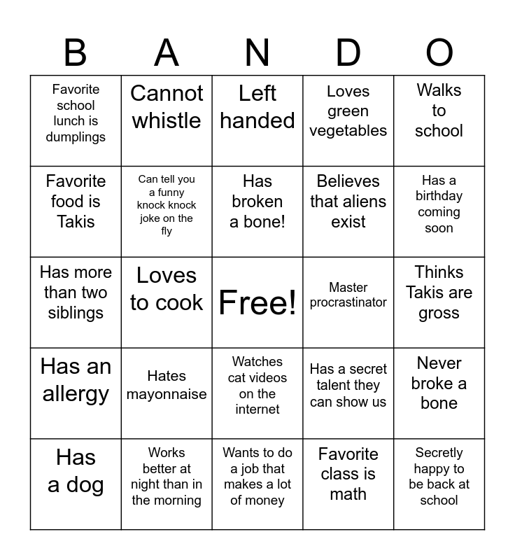 This bingo card has a free space and 29 words: Has a dog, Has a corny dance move they are willing to demonstrate, Loves to cook, Plays a sport, Favorite school lunch is dumplings, Left handed, Can tell you a funny knock knock joke on the fly, Hates mayonnaise, Master procrastinator, Works better at night than in the morning, Thinks Takis are gross, Secretly happy to be back at school, Wants to do a job that makes a lot of money, Favorite class is math, Has a birthday coming soon, Favorite color is green, Watches cat videos on the internet, Has an allergy, Walks to school, Has more than two siblings, Has a secret talent they can show us, Has a pet that is not a cat or a dog, Believes that aliens exist, Favorite food is Takis, Loves green vegetables, Cannot whistle, Never broke a bone, Has broken a bone! and Can do a cartwheel (please do NOT show us).
