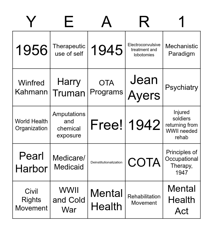 This bingo card has a free space and 29 words: Civil Rights Movement, The Great Depression, Amputations and chemical exposure, Eleanor Clark Slagle, 1956, 1945, Harry Truman, Medicare/ Medicaid, 1942, WWII and Cold War, Injured soldiers returning from WWII needed rehab, Mental Health Act, Mental Health, Rehabilitation Movement, Psychiatry, Polio, Deinstitutionalization, Pearl Harbor, Mechanistic Paradigm, World Health Organization, COTA, 1958, Jean Ayers, Winfred Kahmann, Electroconvulsive treatment and lobotomies, Therapeutic use of self, Principles of Occupational Therapy, 1947, OTA Programs and Goniometry.