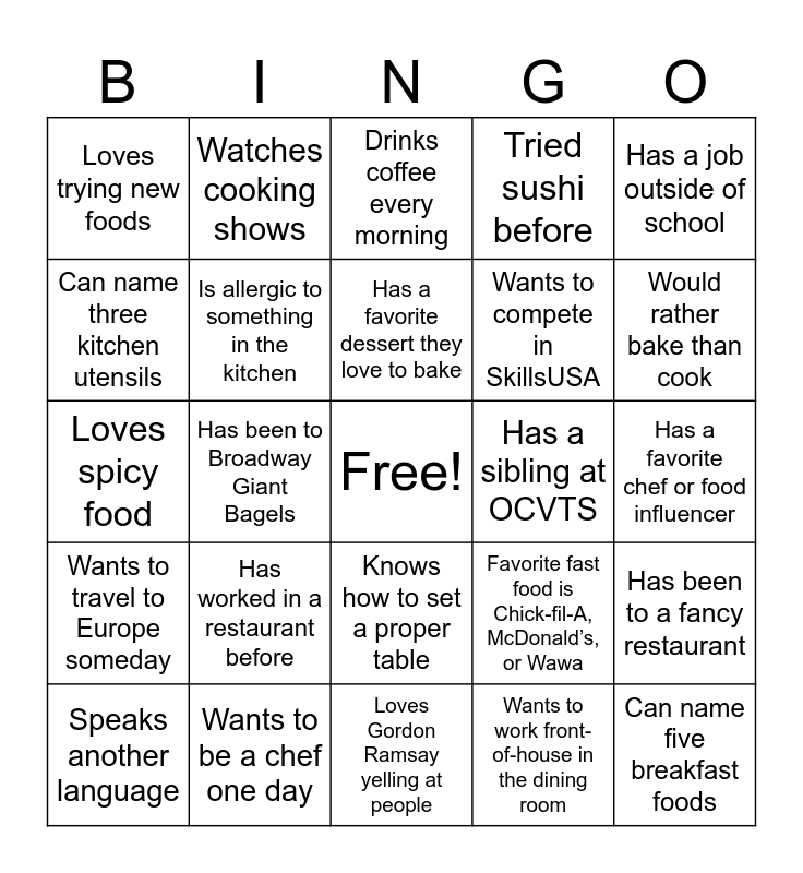 This bingo card has a free space and 24 words: Has worked in a restaurant before, Wants to be a chef one day, Has a favorite dessert they love to bake, Speaks another language, Has a job outside of school, Loves trying new foods, Can name three kitchen utensils, Watches cooking shows, Has a sibling at OCVTS, Knows how to set a proper table, Wants to compete in SkillsUSA, Loves spicy food, Favorite fast food is Chick-fil-A, McDonald’s, or Wawa, Has been to a fancy restaurant, Is allergic to something in the kitchen, Wants to work front-of-house in the dining room, Has a favorite chef or food influencer, Drinks coffee every morning, Would rather bake than cook, Has been to Broadway Giant Bagels, Can name five breakfast foods, Wants to travel to Europe someday, Tried sushi before and Loves Gordon Ramsay yelling at people.