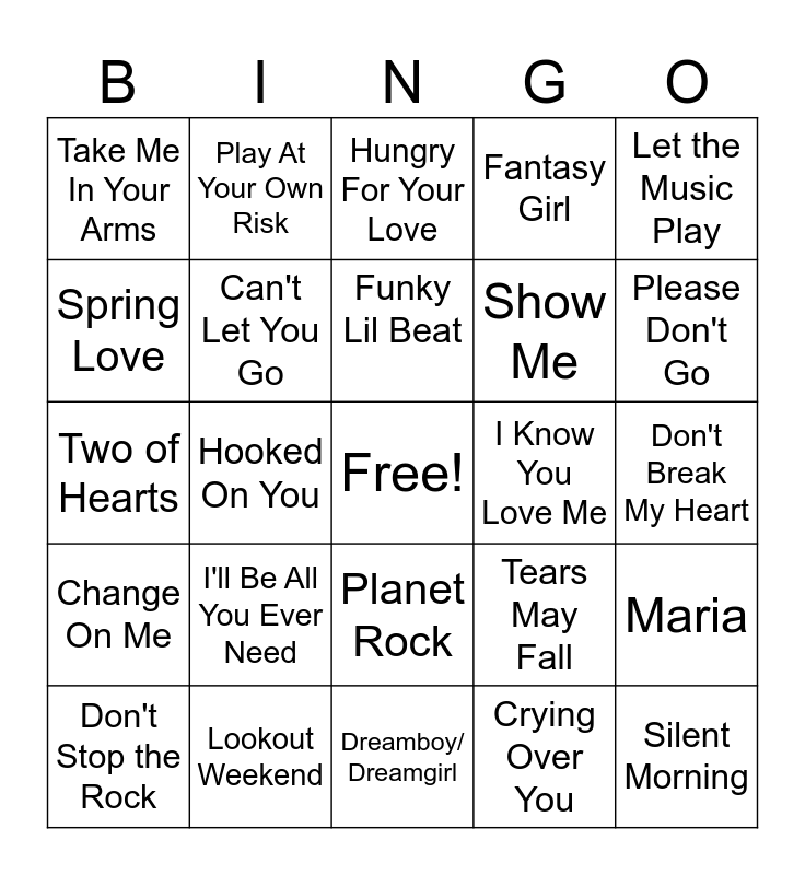 This bingo card has a free space and 24 words: I'll Be All You Ever Need, Lookout Weekend, Funky Lil Beat, Don't Stop the Rock, Let the Music Play, Take Me In Your Arms, Spring Love, Play At Your Own Risk, I Know You Love Me, Planet Rock, Show Me, Two of Hearts, Tears May Fall, Maria, Can't Let You Go, Crying Over You, Don't Break My Heart, Hungry For Your Love, Please Don't Go, Hooked On You, Silent Morning, Change On Me, Fantasy Girl and Dreamboy/ Dreamgirl.