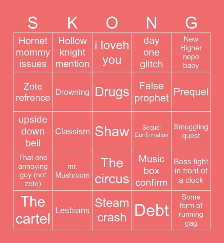 This bingo card has a free space and 24 words: mr. Mushroom, Lesbians, Drugs, The cartel, New Higher nepo baby, Hornet mommy issues, Zote refrence, Hollow knight mention, Sequel Confirmation, The circus, False prophet, upside down bell, Music box confirm, Boss fight in front of a clock, Drowning, Debt, Smuggling quest, i loveh you, Prequel, Classism, Some form of running gag, That one annoying guy (not zote), day one glitch and Steam crash.