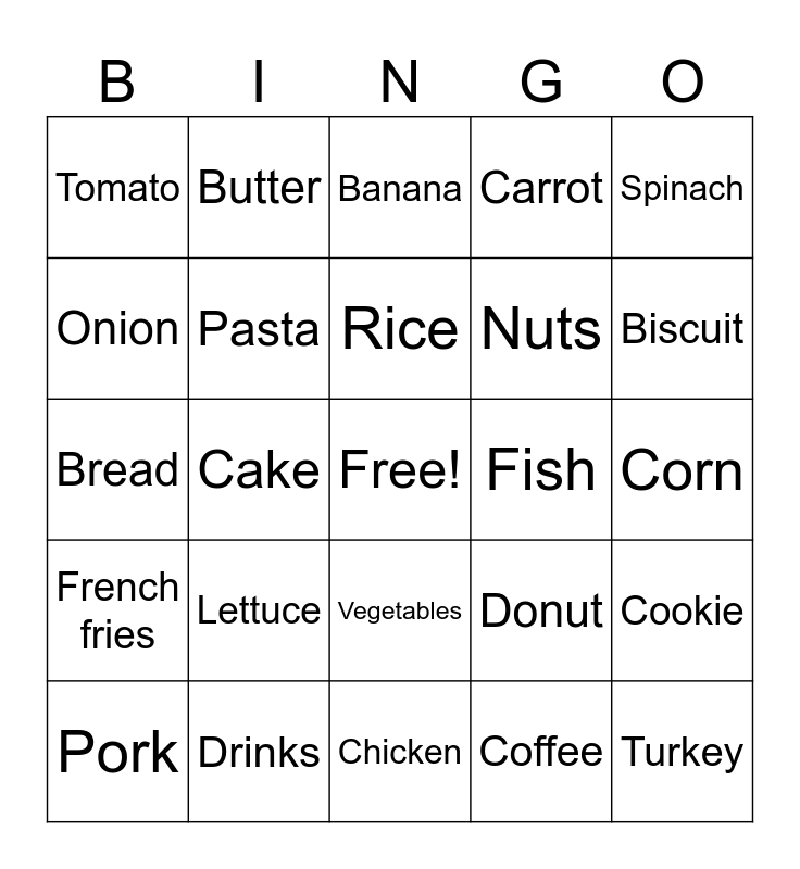 This bingo card has a free space and 79 words: Fruits, Apple, Banana, Orange, Mango, Pineapple, Grape, Strawberry, Watermelon, Lemon, Peach, Vegetables, Carrot, Tomato, Potato, Onion, Cucumber, Lettuce, Broccoli, Corn, Pepper, Spinach, Bread, Rice, Pasta, Noodles, Cereal, Tortilla, Oats, Pancake, Biscuit, Crackers, Chicken, Beef, Pork, Fish, Shrimp, Egg, Sausage, Turkey, Tuna, Ham, Milk, Cheese, Yogurt, Butter, Cream, Ice cream, Chocolate, Candy, Cookie, Cake, Donut, Chips, Popcorn, Pie, Healthy Food, Salad, Fruit, Vegetables, Nuts, bread, Smoothie, Fast Food, Hamburger, Hot dog, Pizza, Sandwich, Fried chicken, French fries, Drinks, Water, Juice, Soda, Tea, Coffee, Milkshake, Lemonade and Smoothie.