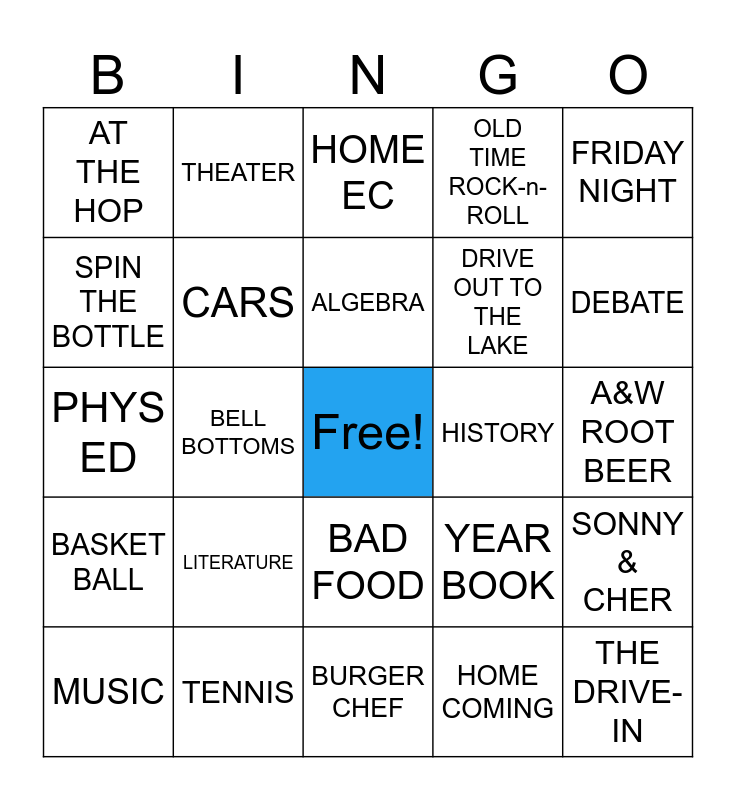 This bingo card has a free space and 34 words: DANCE, HOME COMING, FOOTBALL, SOCCER, BASKET BALL, CARS, FRIDAY NIGHT, MUSIC, THEATER, ART, ALGEBRA, HOME EC, WOOD SHOP, ENGLISH, HISTORY, DEBATE, TENNIS, PHYS ED, LITERATURE, YEAR BOOK, BAD FOOD, CLASS RING, AT THE HOP, A&W ROOT BEER, BURGER CHEF, THE DRIVE-IN, OLD TIME ROCK-n-ROLL, SKIPPING CLASS, DRIVE OUT TO THE LAKE, SPIN THE BOTTLE, TRUTH OR DARE, BELL BOTTOMS, SONNY & CHER and LAUGH IN.