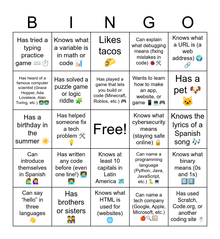 This bingo card has a free space and 50 words: Knows what an algorithm is (a set of steps or instructions) ๐, Has used Scratch, Code.org, or another coding site ๐ฑ๏ธ, Can name one computer part (CPU, mouse, keyboard, etc.) ๐ฅ๏ธโจ๏ธ๐ฑ๏ธ, Knows what HTML is used for (websites) ๐, Has written any code before (even one line!) ๐ฉโ๐ป๐จโ๐ป, Can explain what a loop is in simple terms ๐, Knows what a variable is in math or code ๐, Can describe what happens when you press โRunโ on code โถ๏ธ, Has heard of a famous computer scientist (Grace Hopper, Ada Lovelace, Alan Turing, etc.) ๐ฉโ๐ป๐จโ๐ป, Knows the difference between hardware and software ๐พ๐ ๏ธ, Has solved a puzzle game or logic riddle ๐งฉ, Can explain what debugging means (fixing mistakes in code) ๐๐ ๏ธ, Knows what binary means (0s and 1s) 0๏ธโฃ1๏ธโฃ, Can name a programming language (Python, Java, JavaScript, etc.) ๐๐ป, Has designed something on a computer (slide, drawing, video, etc.) ๐จ๐ป, Can explain the difference between input and output โจ๏ธโก๏ธ๐ฅ๏ธ, Has played a game that lets you build or code (Minecraft, Roblox, etc.) ๐ฎ, Knows what cybersecurity means (staying safe online) ๐, Can describe what an if/else is (making a choice in code) ๐คโก๏ธ, Knows what a URL is (a web address) ๐๐, Has helped someone fix a tech problem ๐ ๏ธ๐ก, Can name a tech company (Google, Apple, Microsoft, etc.) ๐๐๐ช, Has tried a typing practice game โจ๏ธโฑ๏ธ, Wants to learn how to make an app, website, or game ๐ฑ๐ป๐ฎ, Has used AI tools (like ChatGPT or an AI art app) ๐ค๐จ, Likes to dance ๐, Has a pet ๐ถ๐ฑ, Speaks another language ๐, Likes tacos ๐ฎ, Knows at least 10 capitals in Latin America ๐บ๏ธ, Can count to thirty in Spanish 3๏ธโฃ0๏ธโฃ, Likes to read for fun ๐, Has had a conversation with a random person in Spanish ๐ฌ, Has traveled to Latin America โ๏ธ, Has brothers or sisters ๐จโ๐ฉโ๐งโ๐ฆ, Likes soccer โฝ, Has traveled to another country ๐โ๏ธ, Can say the colors in Spanish ๐จ, Likes to sing ๐ค, Knows the lyrics of a Spanish song ๐ถ, Likes chocolate ๐ซ, Can name five Spanish-speaking countries ๐, Has eaten empanadas ๐ฅ, Has watched a movie in Spanish ๐ฌ, Can say โhelloโ in three languages ๐, Has a birthday in the summer โ๏ธ, Can name at least 5 animals in Spanish ๐๐๐, Likes to draw or paint ๐จ๐๏ธ, Can introduce themselves in Spanish ๐โโ๏ธ๐โโ๏ธ and Likes spicy food ๐ถ๏ธ.