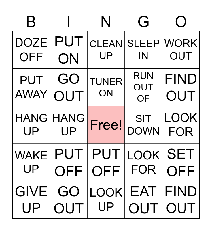 ⚠ This card has duplicate items: FALL FOR (2), FIND OUT (2), GIVE UP (2), LOOK UP (2), PUT OFF (2), WAKE UP (2), PUT ON (2), WASH UP (2), PUT AWAY (2), WIND WO (2), GO OUT (2), SLEEP IN (2), SET OFF (2), LOOK FOR (2), LOOK AFTER (2), DRESS UP (2), TUNER ON (2), SIT DOWN (2), CLEAN UP (2), WORK OUT (2), HANG UP (2), EAT OUT (2), DOZE OFF (2), RUN OUT OF (2)