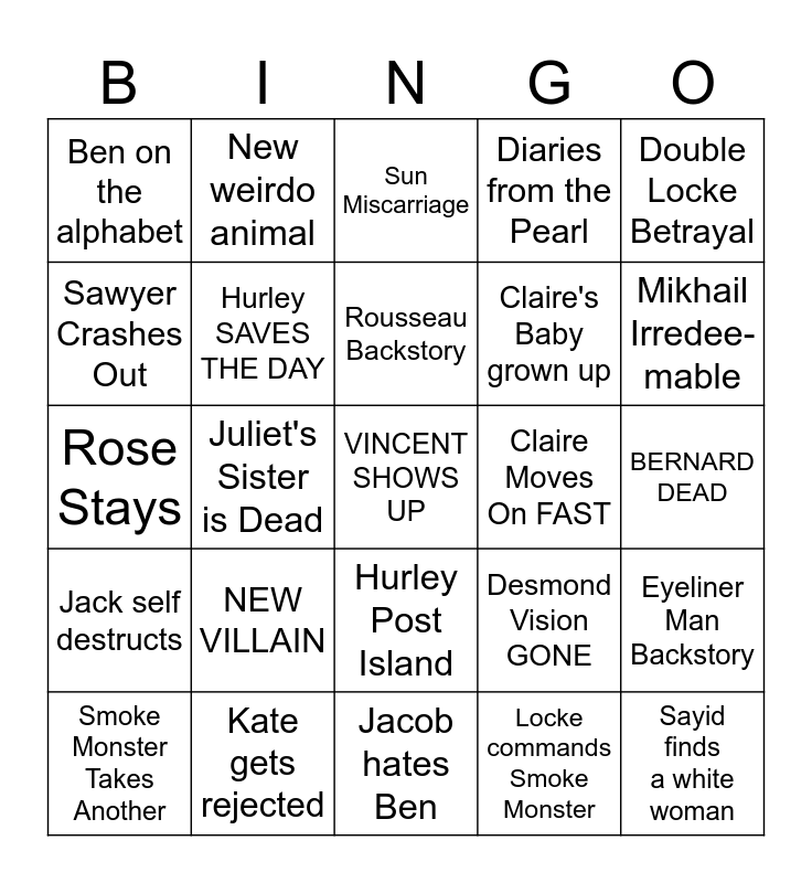 This bingo card has a free space and 24 words: NEW VILLAIN, Kate gets rejected, Rousseau Backstory, Smoke Monster Takes Another, Double Locke Betrayal, Ben on the alphabet, Sawyer Crashes Out, New weirdo animal, Claire Moves On FAST, Hurley Post Island, Claire's Baby grown up, Rose Stays, Desmond Vision GONE, Eyeliner Man Backstory, Hurley SAVES THE DAY, Locke commands Smoke Monster, BERNARD DEAD, Sun Miscarriage, Mikhail Irredee- mable, Juliet's Sister is Dead, Sayid finds a white woman, Jack self destructs, Diaries from the Pearl and Jacob hates Ben.