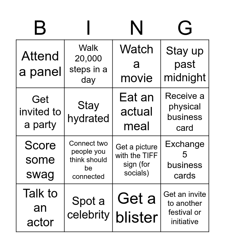 This bingo card has 16 words: Spot a celebrity, Exchange 5 business cards, Watch a movie, Attend a panel, Score some swag, Walk 20,000 steps in a day, Get a picture with the TIFF sign (for socials), Get a blister, Get invited to a party, Stay hydrated, Talk to an actor, Stay up past midnight, Connect two people you think should be connected, Receive a physical business card, Eat an actual meal and Get an invite to another festival or initiative.