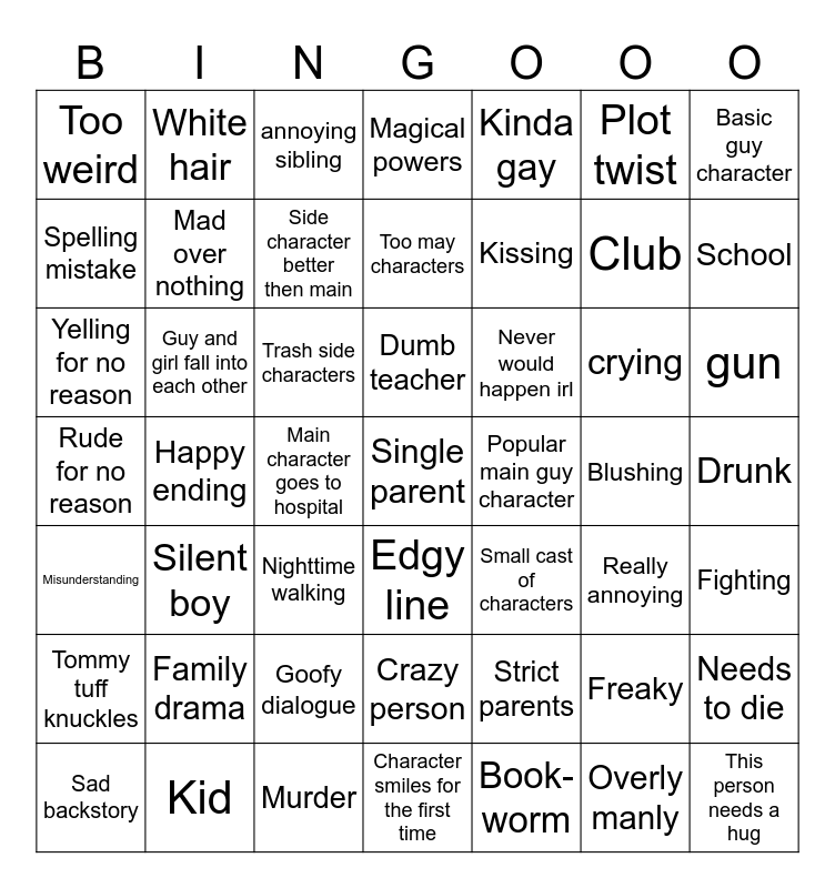 This bingo card has a free space and 48 words: Misunderstanding, Happy ending, Murder, Edgy line, Kissing, Blushing, Basic guy character, Sad backstory, Guy and girl fall into each other, Main character goes to hospital, Magical powers, Kinda gay, crying, gun, Rude for no reason, Family drama, annoying sibling, Dumb teacher, Strict parents, Plot twist, School, Spelling mistake, White hair, Side character better then main, Book-worm, Club, Drunk, Tommy tuff knuckles, Silent boy, Trash side characters, Crazy person, Never would happen irl, Freaky, Needs to die, Too weird, Kid, Nighttime walking, Character smiles for the first time, Popular main guy character, Overly manly, Fighting, Yelling for no reason, Mad over nothing, Goofy dialogue, Too may characters, Small cast of characters, Really annoying and This person needs a hug.