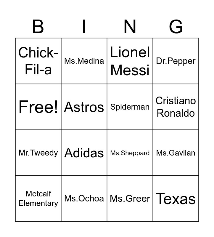 This bingo card has 16 words: Ms.Ochoa, Ms.Gavilan, Lionel Messi, Chick-Fil-a, Mr.Tweedy, Ms.Medina, Ms.Sheppard, Ms.Greer, Free!, Astros, Metcalf Elementary, Dr.Pepper, Adidas, Cristiano Ronaldo, Spiderman and Texas.