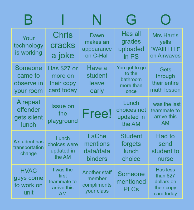 This bingo card has a free space and 24 words: HVAC guys come to work on unit, Lunch choices were updated in the AM, Have a student leave early, Someone mentioned PLCs, Mrs Harris yells "WAIIITTT!" on Airwaves, Your technology is working, Chris cracks a joke, Dawn makes an appearance on C-Hall, Lunch choices not updated in the AM, I was the last teammate to arrive this AM, A repeat offender gets silent lunch, Has $27 or more on their copy card today, Student forgets lunch choice, Had to send student to nurse, Someone came to observe in your room, I was the first teammate to arrive this AM, Another staff member compliments your class, Has all grades uploaded in PS, Gets through their entire math lesson, A student has transportation change, Issue on the playground, LaChe mentions data/data binders, You got to go to the bathroom more than once and Has less than $27 dollars on their copy card today.
