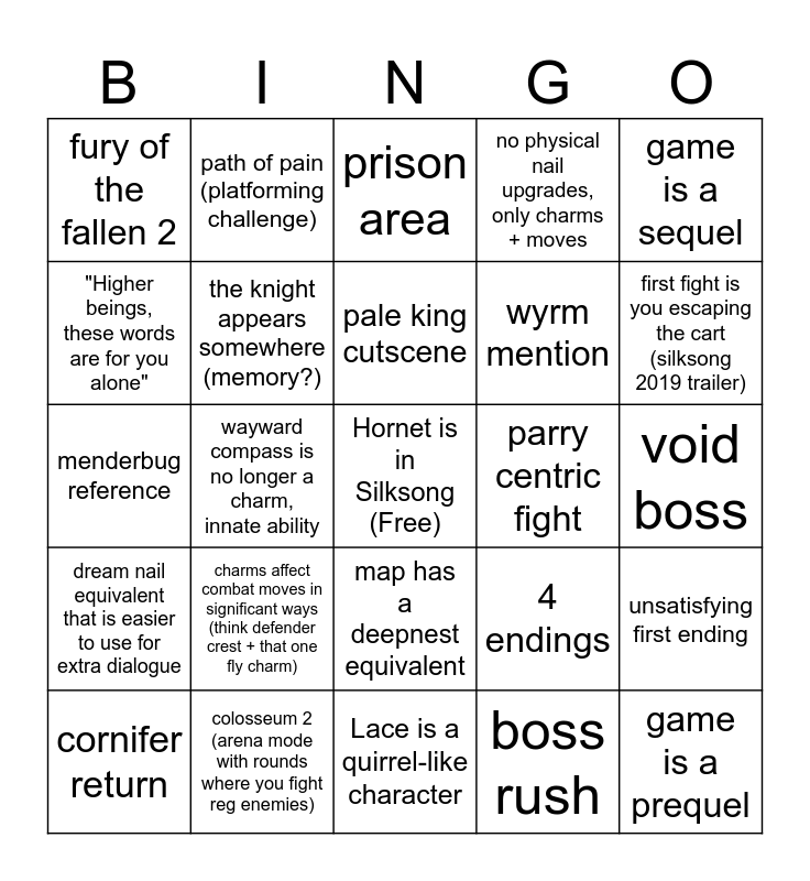 This bingo card has a free space and 24 words: charms affect combat moves in significant ways (think defender crest + that one fly charm), colosseum 2 (arena mode with rounds where you fight reg enemies), pale king cutscene, cornifer return, game is a sequel, fury of the fallen 2, "Higher beings, these words are for you alone", path of pain (platforming challenge), parry centric fight, map has a deepnest equivalent, wyrm mention, menderbug reference, 4 endings, unsatisfying first ending, the knight appears somewhere (memory?), boss rush, void boss, prison area, first fight is you escaping the cart (silksong 2019 trailer), wayward compass is no longer a charm, innate ability, game is a prequel, dream nail equivalent that is easier to use for extra dialogue, no physical nail upgrades, only charms + moves and Lace is a quirrel-like character.