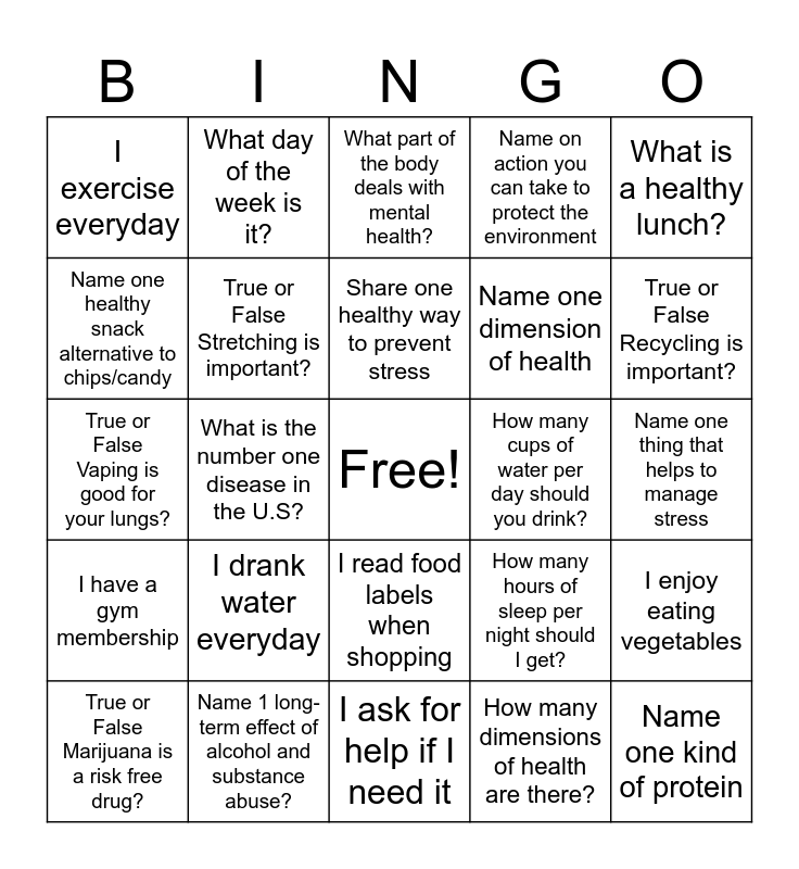 This bingo card has a free space and 24 words: I drank water everyday, Name 1 long-term effect of alcohol and substance abuse?, Share one healthy way to prevent stress, True or False Marijuana is a risk free drug?, What is a healthy lunch?, I exercise everyday, Name one healthy snack alternative to chips/candy, What day of the week is it?, How many cups of water per day should you drink?, I read food labels when shopping, Name one dimension of health, True or False Vaping is good for your lungs?, How many hours of sleep per night should I get?, I enjoy eating vegetables, True or False Stretching is important?, How many dimensions of health are there?, Name one thing that helps to manage stress, What part of the body deals with mental health?, True or False Recycling is important?, What is the number one disease in the U.S?, Name one kind of protein, I have a gym membership, Name on action you can take to protect the environment and I ask for help if I need it.