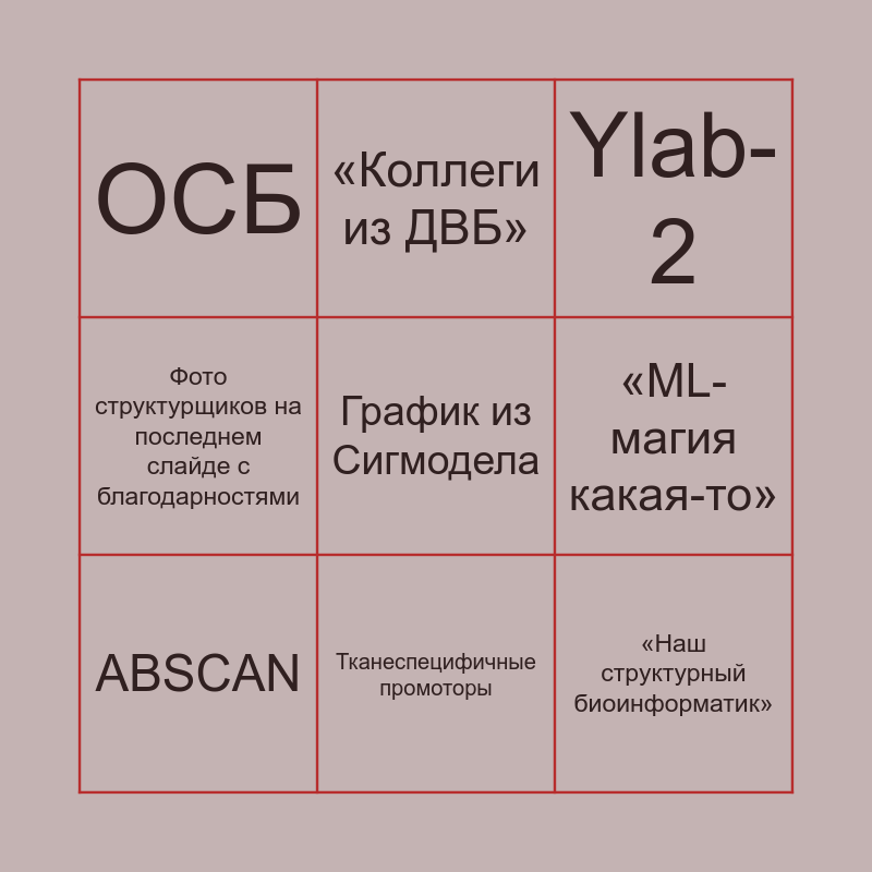 This bingo card has 9 words: ABSCAN, Ylab-2, «Коллеги из ДВБ», Фото структурщиков на последнем слайде с благодарностями, ОСБ, «ML-магия какая-то», График из Сигмодела, «Наш структурный биоинформатик» and Тканеспецифичные промоторы.