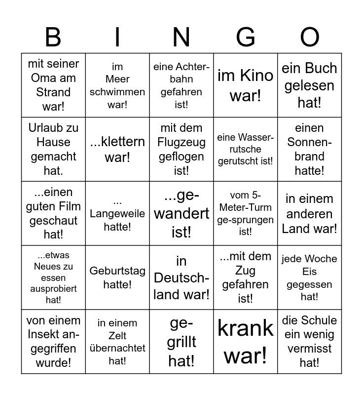 This bingo card has a free space and 24 words: Geburtstag hatte!, in einem Zelt übernachtet hat!, mit dem Flugzeug geflogen ist!, von einem Insekt an-gegriffen wurde!, ein Buch gelesen hat!, mit seiner Oma am Strand war!, Urlaub zu Hause gemacht hat., im Meer schwimmen war!, vom 5-Meter-Turm ge-sprungen ist!, in Deutsch-land war!, eine Wasser-rutsche gerutscht ist!, ...einen guten Film geschaut hat!, ...mit dem Zug gefahren ist!, jede Woche Eis gegessen hat!, ...klettern war!, krank war!, in einem anderen Land war!, eine Achter-bahn gefahren ist!, einen Sonnen-brand hatte!, ... Langeweile hatte!, die Schule ein wenig vermisst hat!, ...etwas Neues zu essen ausprobiert hat!, im Kino war! and ge- grillt hat!.
