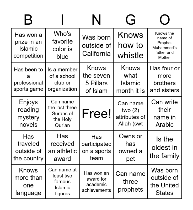 This bingo card has a free space and 24 words: Knows more than one language, Has received an athletic award, Knows the seven 5 Pillars of Islam, Can name three prophets, Knows the name of Prophet Muhammed’s father and Mother, Has won a prize in an Islamic competition, Who's favorite color is blue, Was born outside of California, Can name two (2) attributes of Allah (swt, Can write their name in Arabic, Enjoys reading mystery novels, Is a member of a school club or organization, Owns or has owned a pet, Is the oldest in the family, Has been to a professional sports game, Can name at least two famous Islamic figures, Has won an award for academic achievements, Knows how to whistle, Has four or more brothers and sisters, Has traveled outside of the country, Can name the last three Surahs of the Holy Qur’an, Has participated on a sports team, Knows what Islamic month it is and Was born outside of the United States.