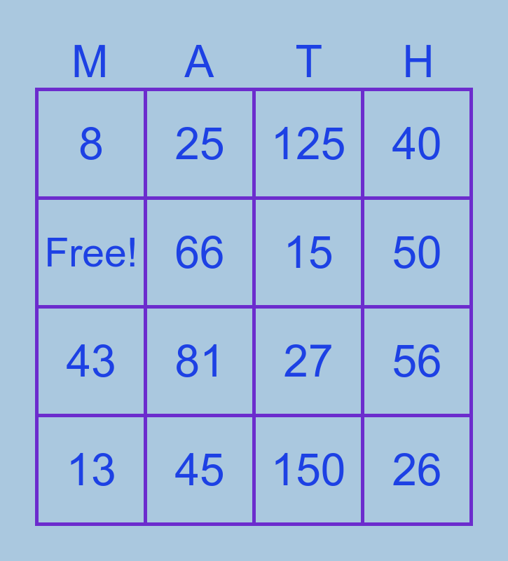 This bingo card has 16 words: 45, 56, 125, 8, 43, 25, 27, 150, Free!, 66, 13, 40, 81, 50, 15 and 26.