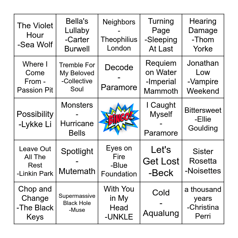 This bingo card has a free space and 40 words: Flightless Bird, American Mouth -Iron & Wine, Possibility -Lykke Li, Full Moon -The Black Ghosts, Tremble For My Beloved -Collective Soul, Supermassive Black Hole -Muse, Eyes on Fire -Blue Foundation, Decode -Paramore, Meet Me on the Equinox -Death Cab for Cutie, Hearing Damage -Thom Yorke, Leave Out All The Rest -Linkin Park, Monsters -Hurricane Bells, Turning Page -Sleeping At Last, a thousand years -Christina Perri, Bittersweet -Ellie Goulding, I Caught Myself -Paramore, Spotlight -Mutemath, 15 Step -Radiohead, The Violet Hour -Sea Wolf, From Now On -The Features, Neighbors -Theophilius London, Sister Rosetta -Noisettes, Cold -Aqualung, Requiem on Water -Imperial Mammoth, Where I Come From -Passion Pit, The Forgotten -Green Day, Everything and Nothing -The Boom Circuits, The Antidote -St. Vincent, Speak Up -POP ETC, Eclipse (All Yours) -Metric, ...Neutron Star Collision -Muse, Heavy In Your Arms -Florence + The Machine, Chop and Change -The Black Keys, Rolling In On A Burning Tire -Pickin' On Series, Let's Get Lost -Beck, Jonathan Low -Vampire Weekend, With You in My Head -UNKLE, What Part of Forever -CeeLo Green, Love Is Worth the Fall -O.A.R., Bella's Lullaby -Carter Burwell and Let Me Sign -Ceekay Jones / Robert Pattinson.