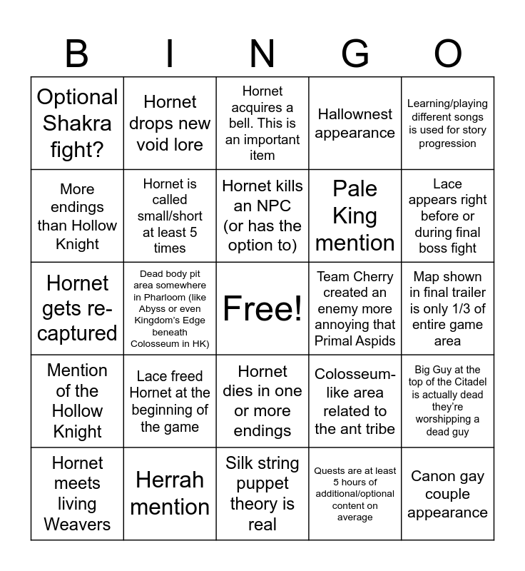 This bingo card has a free space and 24 words: Lace freed Hornet at the beginning of the game, Herrah mention, Hornet kills an NPC (or has the option to), Hornet meets living Weavers, Learning/playing different songs is used for story progression, Optional Shakra fight?, More endings than Hollow Knight, Hornet drops new void lore, Team Cherry created an enemy more annoying that Primal Aspids, Hornet dies in one or more endings, Pale King mention, Hornet gets re-captured, Colosseum-like area related to the ant tribe, Big Guy at the top of the Citadel is actually dead they’re worshipping a dead guy, Hornet is called small/short at least 5 times, Quests are at least 5 hours of additional/optional content on average, Map shown in final trailer is only 1/3 of entire game area, Hornet acquires a bell. This is an important item, Lace appears right before or during final boss fight, Dead body pit area somewhere in Pharloom (like Abyss or even Kingdom’s Edge beneath Colosseum in HK), Canon gay couple appearance, Mention of the Hollow Knight, Hallownest appearance and Silk string puppet theory is real.