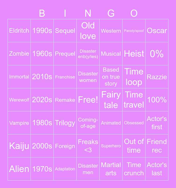 This bingo card has a free space and 48 words: Vampire, 2020s, Adaptation, Coming-of-age, Musical, Time travel, Oscar, Alien, 2010s, Remake, Old love, Western, Time loop, Razzie, Werewolf, 2000s, Sequel, Disaster women, Superhero, Parody/spoof, 0%, Zombie, 1990s, Prequel, Martial arts, Heist, 100%, Kaiju, 1980s, Franchise, Freaks <3, Based on true story, Out of time, Friend rec, Eldritch, 1970s, Trilogy, Disaster men, Fairy tale, Time crunch, Actor's first, Immortal, 1960s, Foreign, Disaster enb(y/ies), Animated, Obsessed and Actor's last.