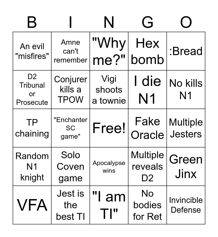 This bingo card has a free space and 24 words: VFA, Solo Coven game, Vigi shoots a townie, No bodies for Ret, :Bread, An evil "misfires", Amne can't remember, "Why me?", Fake Oracle, Multiple Jesters, TP chaining, Conjurer kills a TPOW, Multiple reveals D2, Green Jinx, D2 Tribunal or Prosecute, Jest is the best TI, "I am TI", Hex bomb, No kills N1, Random N1 knight, "Enchanter SC game", Apocalypse wins, I die N1 and Invincible Defense.