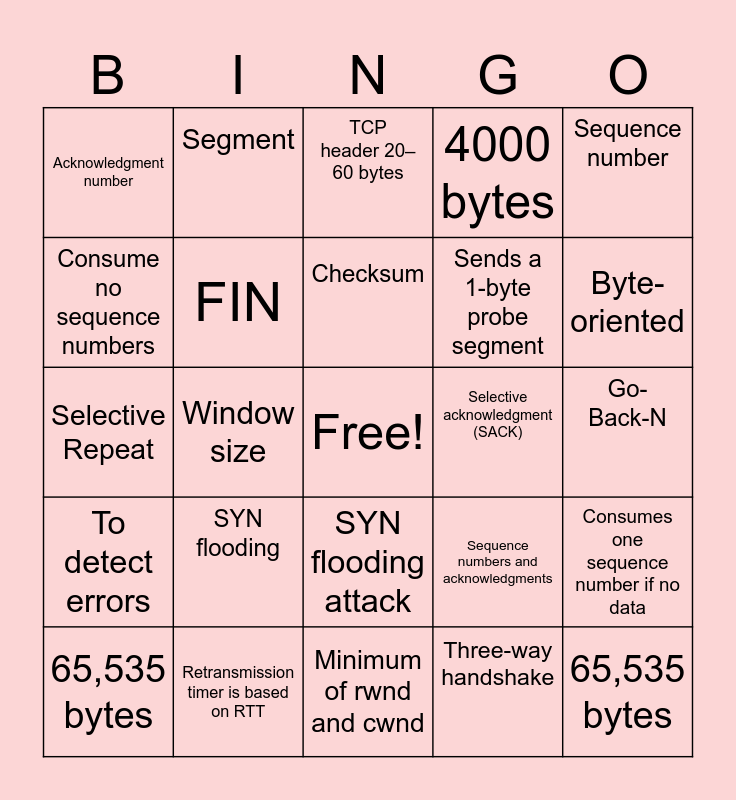 This bingo card has a free space and 24 words: 65,535 bytes, SYN flooding, Checksum, Three-way handshake, Sequence number, Acknowledgment number, Segment, TCP header 20–60 bytes, Selective acknowledgment (SACK), Go-Back-N, Selective Repeat, FIN, Sequence numbers and acknowledgments, Consumes one sequence number if no data, Consume no sequence numbers, Retransmission timer is based on RTT, Minimum of rwnd and cwnd, 4000 bytes, Byte-oriented, To detect errors, Window size, SYN flooding attack, Sends a 1-byte probe segment and 65,535 bytes.
