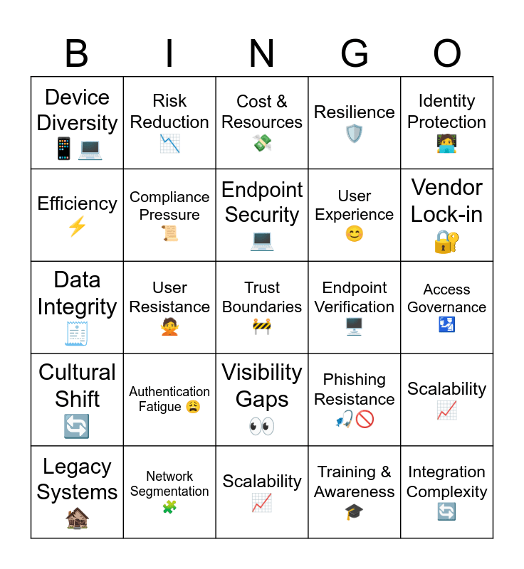 This bingo card has 29 words: Legacy Systems ๐๏ธ, Shadow IT ๐ซ๏ธ, User Resistance ๐ , Integration Complexity ๐, Device Diversity ๐ฑ๐ป, Cost & Resources ๐ธ, Compliance Pressure ๐, Authentication Fatigue ๐ฉ, Endpoint Verification ๐ฅ๏ธ, Network Segmentation ๐งฉ, Access Governance ๐, Trust Boundaries ๐ง, Scalability ๐, Training & Awareness ๐, Vendor Lock-in ๐, Policy Overhaul ๐, Visibility Gaps ๐, Cultural Shift ๐, Identity Protection ๐งโ๐ป, Data Integrity ๐งพ, Phishing Resistance ๐ฃ๐ซ, Compliance ๐, User Experience ๐, Efficiency โก, Resilience ๐ก๏ธ, Risk Reduction ๐, Scalability ๐, Endpoint Security ๐ป and Future-Proofing ๐.