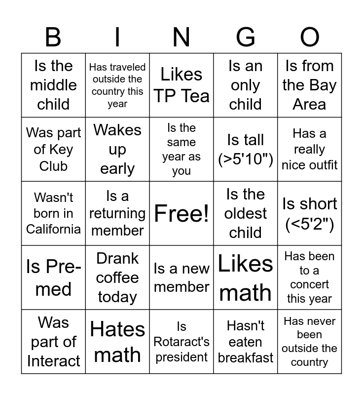 This bingo card has a free space and 34 words: Really likes mangoes, Hasn't eaten breakfast, Has a pet, Is an officer, Is Pre-med, Wakes up early, Is from the Bay Area, Was part of Interact, Has traveled outside the country this year, Wears glasses, Is the same year as you, Likes TP Tea, Can speak another language, Knows how to code, Is the oldest child, Has a really nice outfit, Hates math, Wasn't born in California, Drank coffee today, Likes math, Is a new member, Shares a hobby with you, Is the middle child, Is short (<5'2"), Is Rotaract's president, Has never been outside the country, Is an only child, Is the youngest child, Is tall (>5'10"), Was part of Key Club, Attended RYLA, Is a returning member, Has been to a concert this year and Follows Cal Rotaract on Insta.