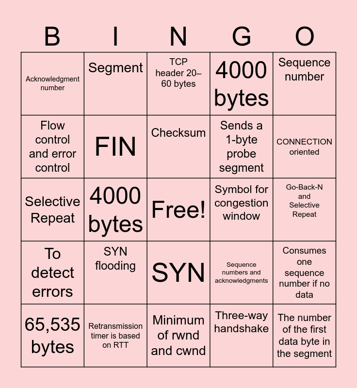 This bingo card has a free space and 24 words: 65,535 bytes, SYN flooding, Checksum, Three-way handshake, Sequence number, Acknowledgment number, Segment, TCP header 20–60 bytes, Symbol for congestion window, Go-Back-N and Selective Repeat, Selective Repeat, FIN, Sequence numbers and acknowledgments, Consumes one sequence number if no data, Flow control and error control, Retransmission timer is based on RTT, Minimum of rwnd and cwnd, 4000 bytes, CONNECTION oriented, To detect errors, 4000 bytes, SYN, Sends a 1-byte probe segment and The number of the first data byte in the segment.