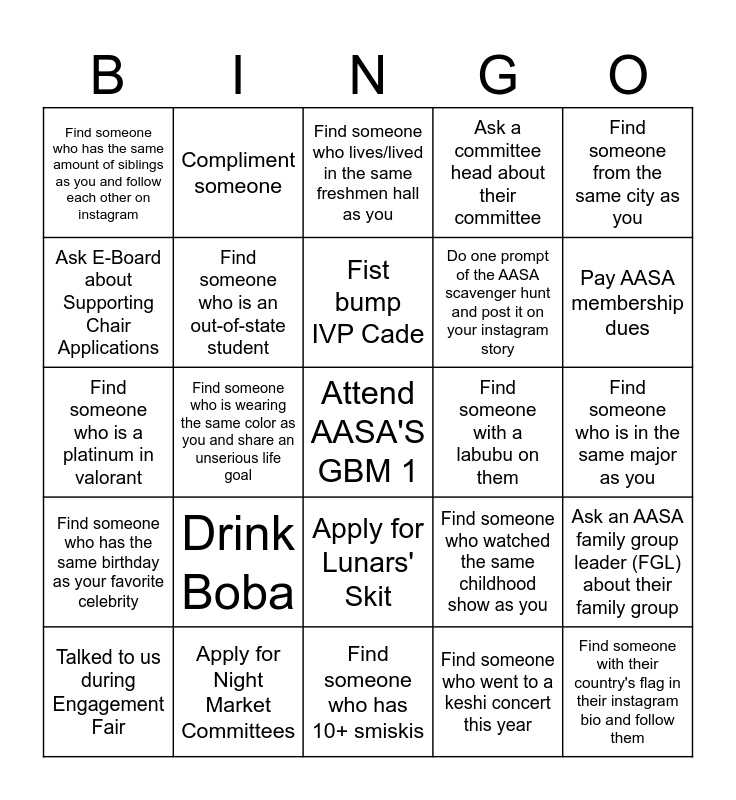 This bingo card has a free space and 24 words: Drink Boba, Apply for Night Market Committees, Fist bump IVP Cade, Talked to us during Engagement Fair, Find someone from the same city as you, Find someone who has the same amount of siblings as you and follow each other on instagram, Ask E-Board about Supporting Chair Applications, Compliment someone, Find someone with a labubu on them, Apply for Lunars' Skit, Do one prompt of the AASA scavenger hunt and post it on your instagram story, Find someone who is a platinum in valorant, Find someone who watched the same childhood show as you, Ask an AASA family group leader (FGL) about their family group, Find someone who is an out-of-state student, Find someone who went to a keshi concert this year, Find someone who is in the same major as you, Find someone who lives/lived in the same freshmen hall as you, Pay AASA membership dues, Find someone who is wearing the same color as you and share an unserious life goal, Find someone with their country's flag in their instagram bio and follow them, Find someone who has the same birthday as your favorite celebrity, Ask a committee head about their committee and Find someone who has 10+ smiskis.