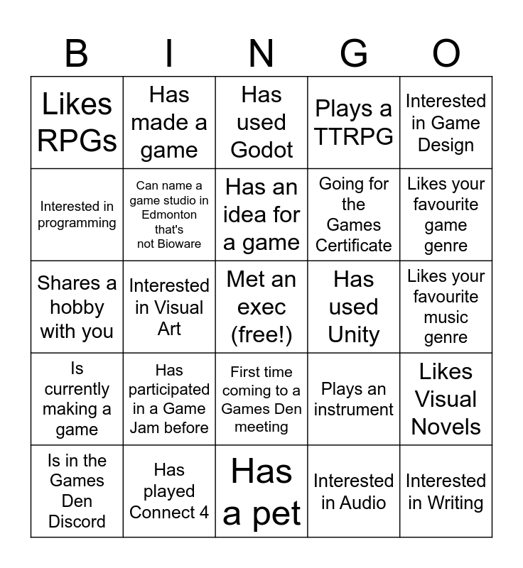 This bingo card has a free space and 24 words: Has participated in a Game Jam before, Has played Connect 4, Has an idea for a game, Is in the Games Den Discord, Interested in Game Design, Likes RPGs, Interested in programming, Has made a game, Has used Unity, First time coming to a Games Den meeting, Going for the Games Certificate, Shares a hobby with you, Plays an instrument, Likes Visual Novels, Can name a game studio in Edmonton that's not Bioware, Interested in Audio, Likes your favourite music genre, Has used Godot, Likes your favourite game genre, Interested in Visual Art, Interested in Writing, Is currently making a game, Plays a TTRPG and Has a pet.
