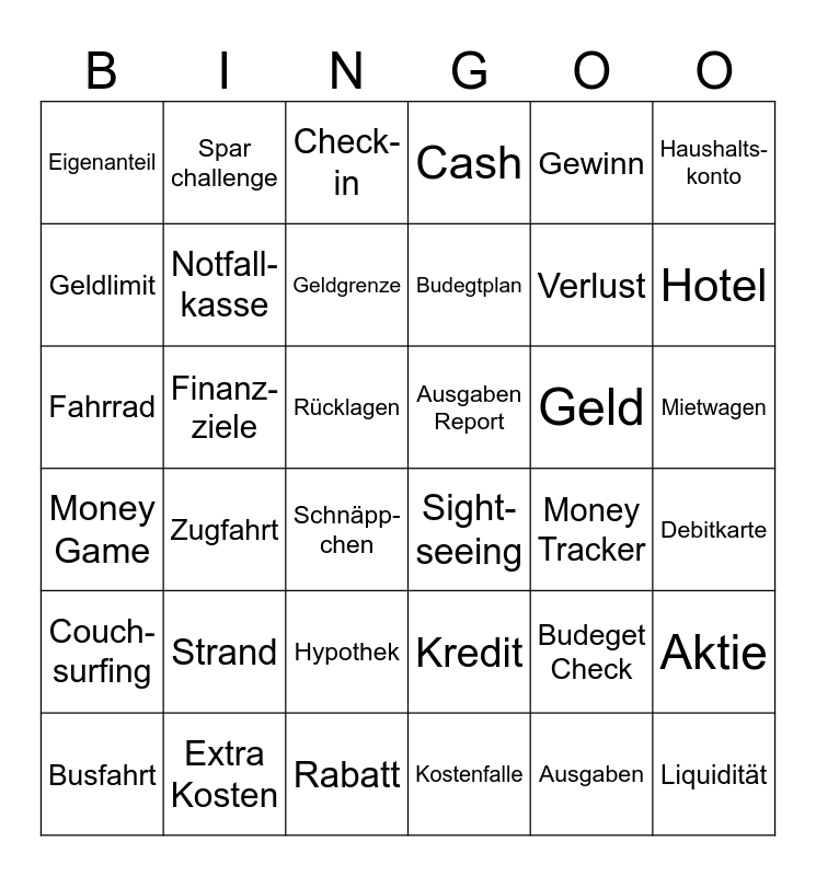 This bingo card has 36 words: Kredit, Hypothek, Kostenfalle, Geldlimit, Money Game, Ausgaben Report, Notfall- kasse, Rabatt, Gewinn, Budeget Check, Hotel, Cash, Aktie, Finanz- ziele, Budegtplan, Eigenanteil, Couch-surfing, Geld, Fahrrad, Check-in, Rücklagen, Zugfahrt, Sight-seeing, Schnäpp-chen, Money Tracker, Spar challenge, Verlust, Extra Kosten, Geldgrenze, Haushalts-konto, Liquidität, Busfahrt, Debitkarte, Mietwagen, Strand and Ausgaben.