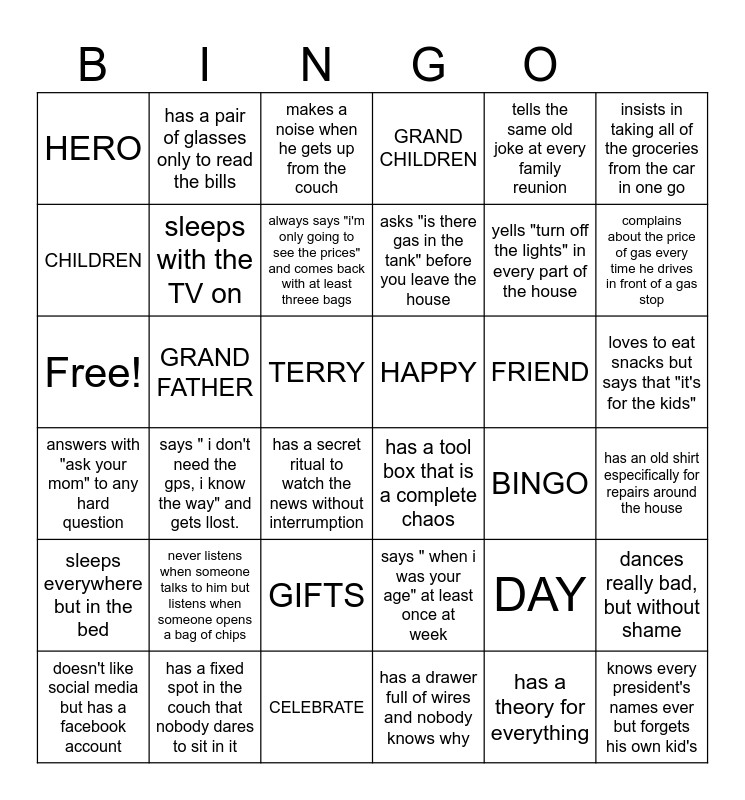 This bingo card has 36 words: says " when i was your age" at least once at week, GIFTS, has a drawer full of wires and nobody knows why, CHILDREN, answers with "ask your mom" to any hard question, HAPPY, sleeps with the TV on, CELEBRATE, tells the same old joke at every family reunion, DAY, complains about the price of gas every time he drives in front of a gas stop, GRAND CHILDREN, dances really bad, but without shame, GRAND FATHER, asks "is there gas in the tank" before you leave the house, HERO, sleeps everywhere but in the bed, FRIEND, Free!, makes a noise when he gets up from the couch, TERRY, says " i don't need the gps, i know the way" and gets llost., has a tool box that is a complete chaos, has a secret ritual to watch the news without interrumption, BINGO, has a pair of glasses only to read the bills, yells "turn off the lights" in every part of the house, has a fixed spot in the couch that nobody dares to sit in it, always says "i'm only going to see the prices" and comes back with at least threee bags, insists in taking all of the groceries from the car in one go, knows every president's names ever but forgets his own kid's, doesn't like social media but has a facebook account, has an old shirt especifically for repairs around the house, loves to eat snacks but says that "it's for the kids", never listens when someone talks to him but listens when someone opens a bag of chips and has a theory for everything.