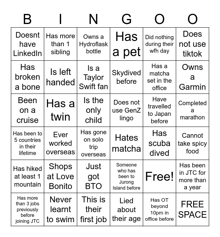 This bingo card has 37 words: Free!, Someone who has been to Jurong Island before, Has OT beyond 10pm in office before, Has broken a bone, Ever worked overseas, Have travelled to Japan before, Is left handed, Lied about their age, Did nothing during their wfh day, Has more than 3 jobs previously before joining JTC, Owns a Garmin, Has a pet, Been on a cruise, Is the only child, Does not use tiktok, Does not use GenZ lingo, Shops at Love Bonito, Owns a Hydroflask bottle, Completed a marathon, Has a twin, Doesnt have LinkedIn, Skydived before, Has gone on solo trip overseas, Has scuba dived, Never learnt to swim, Cannot take spicy food, Has more than 1 sibling, This is their first job, Has been in JTC for more than a year, Just got BTO, Enjoys Kopi O Kosong, Hates matcha, Has a matcha set in the office, Has hiked at least 1 mountain, Has been to 5 countries in their lifetime, Is a Taylor Swift fan and FREE SPACE.