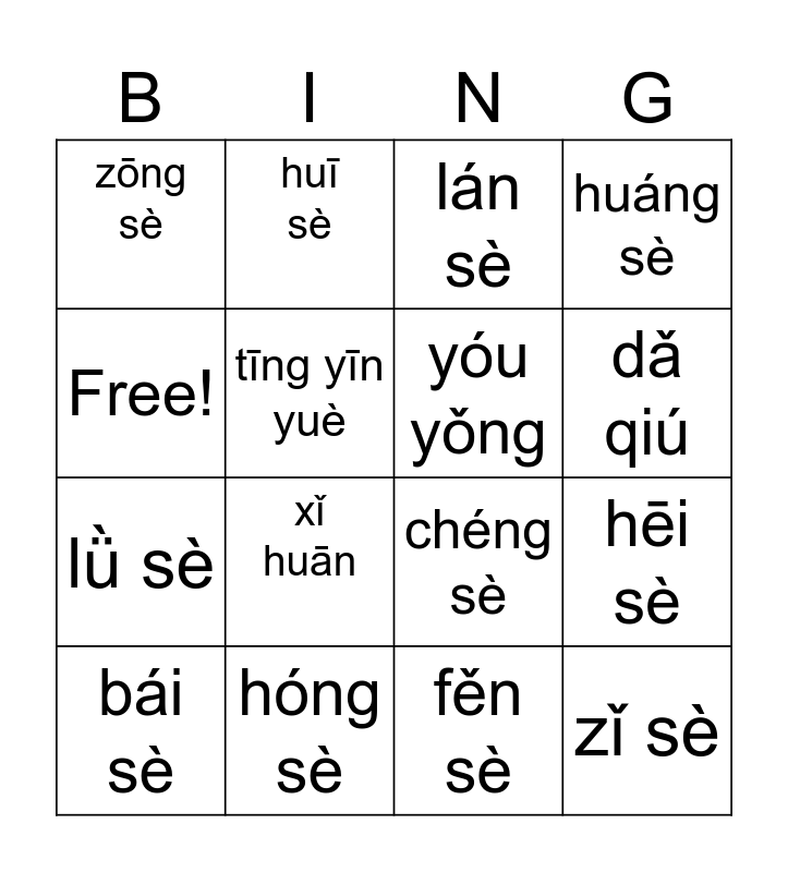 This bingo card has 16 words: hóng sè, hēi sè, lán sè, zōng sè, lǜ sè, huī sè, chéng sè, fěn sè, Free!, tīng yīn yuè, bái sè, huáng sè, xǐ huān, dǎ qiú, yóu yǒng and zǐ sè.