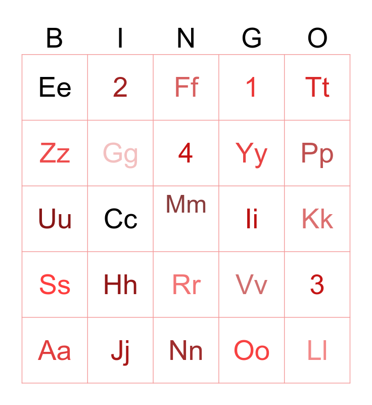 This bingo card has a free space and 29 words: Aa, Bb, Cc, Dd, Ee, Ff, Gg, Hh, Ii, Jj, Kk, Ll, Nn, Oo, Pp, Qq, Rr, Ss, Tt, Uu, Vv, Ww Xx, Yy, Zz, 1, 2, 3, 4 and 5.