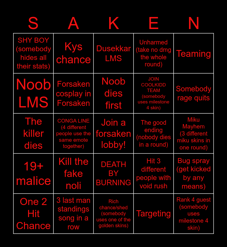 This bingo card has a free space and 34 words: Somebody dies in the first 30 seconds, Targeting, A yourself skin killer, 3 different project moon skins, 19+ malice, Forsaken cosplay in Forsaken, Teaming, One 2 Hit Chance, Kys chance, Dusekkar dies first, Noob dies first, Dusekkar LMS, Taph LMS, A Yourself Noob, The good ending (nobody dies in a round), Somebody rage quits, 3 last man standings song in a row, The killer dies, Kill the fake noli, Hit 3 different people with void rush, DEATH BY BURNING, Preform a Rageing Pace gashing wounds, SHY BOY (somebody hides all their stats), Miku Mayhem (3 different miku skins in one round), Rich chance/shed (somebody uses one of the golden skins), Rank 4 guest (somebody uses milestone 4 skin), Unharmed (take no dmg the whole round), Killer gose under 50% HP, JOIN COOLKIDD TEAM (somebody uses milestone 4 skin), Noob LMS, Hacker, CONGA LINE (4 different people use the same emote together), Bug spray (get kicked by any means) and MOM SAID ITS MY TURN (get killer 2 rounds after being killer).