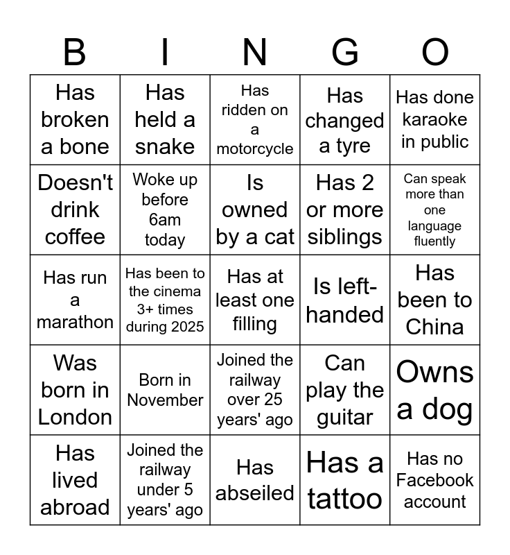 This bingo card has 25 words: Born in November, Has abseiled, Is owned by a cat, Has lived abroad, Has done karaoke in public, Has broken a bone, Doesn't drink coffee, Has held a snake, Is left-handed, Joined the railway over 25 years' ago, Has 2 or more siblings, Has run a marathon, Can play the guitar, Owns a dog, Woke up before 6am today, Has no Facebook account, Has been to China, Has ridden on a motorcycle, Can speak more than one language fluently, Has been to the cinema 3+ times during 2025, Has at least one filling, Joined the railway under 5 years' ago, Was born in London, Has changed a tyre and Has a tattoo.
