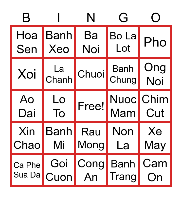 This bingo card has a free space and 24 words: Banh Mi, Goi Cuon, Chuoi, Ca Phe Sua Da, Pho, Hoa Sen, Xoi, Banh Xeo, Nuoc Mam, Rau Mong, Banh Chung, Ao Dai, Non La, Xe May, La Chanh, Banh Trang, Chim Cut, Ba Noi, Ong Noi, Lo To, Cam On, Xin Chao, Bo La Lot and Cong An.