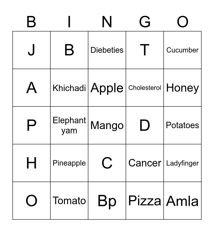 This bingo card has a free space and 29 words: Shegaon kachori, Tomato, Diebeties, Maggie, Cucumber, J, Khichadi, Apple, D, Ladyfinger, O, Elephant yam, Pizza, Amla, P, Samosa, Bp, Cancer, Honey, H, Pineapple, G, Cholesterol, Potatoes, A, B, C, T and I.