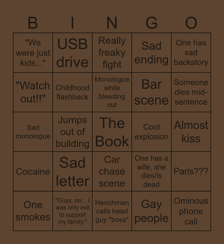 This bingo card has a free space and 34 words: Enemies to lovers, Gay people, See each other in opposing ends of a fight, Gangsters, Cocaine, Childhood flashback, One has sad backstory, One smokes, USB drive, Booker is computer nerd, Monologue while bleeding out, Really freaky fight, "You won't get away with this!", Coffee, Cool explosion, Someone dies mid-sentence, "Guys, no... I was only evil to support my family.", Sad monologue, Sad letter, One has a wife, she dies/is dead, Car chase scene, Booker says book??, "We were just kids...", Almost kiss, Henchman calls head guy "boss", Ominous phone call, Sad ending, Sacrificial act, Bar scene, "Watch out!!", Loads of guns, Jumps out of building, Paris??? and One of them switches to the other side.