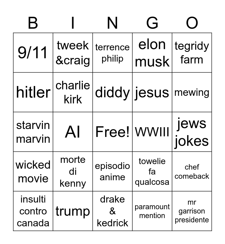 This bingo card has a free space and 24 words: morte di kenny, trump, diddy, insulti contro canada, tegridy farm, 9/11, hitler, tweek &craig, WWIII, episodio anime, jesus, starvin marvin, towelie fa qualcosa, chef comeback, charlie kirk, paramount mention, jews jokes, terrence philip, mewing, AI, mr garrison presidente, wicked movie, elon musk and drake & kedrick.
