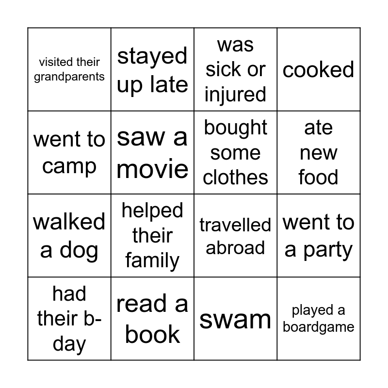 This bingo card has 16 words: read a book, went to a party, was sick or injured, visited their grandparents, walked a dog, stayed up late, travelled abroad, swam, went to camp, saw a movie, had their b-day, cooked, helped their family, ate new food, bought some clothes and played a boardgame.