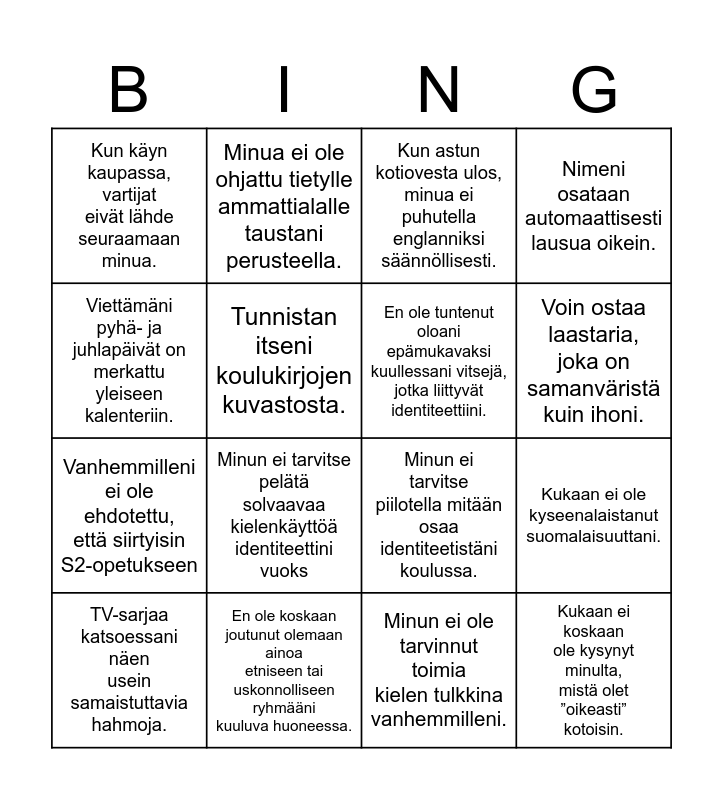 This bingo card has 16 words: En ole koskaan joutunut olemaan ainoa etniseen tai uskonnolliseen ryhmääni kuuluva huoneessa., Kukaan ei ole kyseenalaistanut suomalaisuuttani., Kun astun kotiovesta ulos, minua ei puhutella englanniksi säännöllisesti., Kun käyn kaupassa, vartijat eivät lähde seuraamaan minua., Vanhemmilleni ei ole ehdotettu, että siirtyisin S2-opetukseen, Minua ei ole ohjattu tietylle ammattialalle taustani perusteella., Minun ei tarvitse piilotella mitään osaa identiteetistäni koulussa., Minun ei ole tarvinnut toimia kielen tulkkina vanhemmilleni., Viettämäni pyhä- ja juhlapäivät on merkattu yleiseen kalenteriin., Tunnistan itseni koulukirjojen kuvastosta., TV-sarjaa katsoessani näen usein samaistuttavia hahmoja., Nimeni osataan automaattisesti lausua oikein., Minun ei tarvitse pelätä solvaavaa kielenkäyttöä identiteettini vuoks, Voin ostaa laastaria, joka on samanväristä kuin ihoni., En ole tuntenut oloani epämukavaksi kuullessani vitsejä, jotka liittyvät identiteettiini. and Kukaan ei koskaan ole kysynyt minulta, mistä olet ”oikeasti” kotoisin..