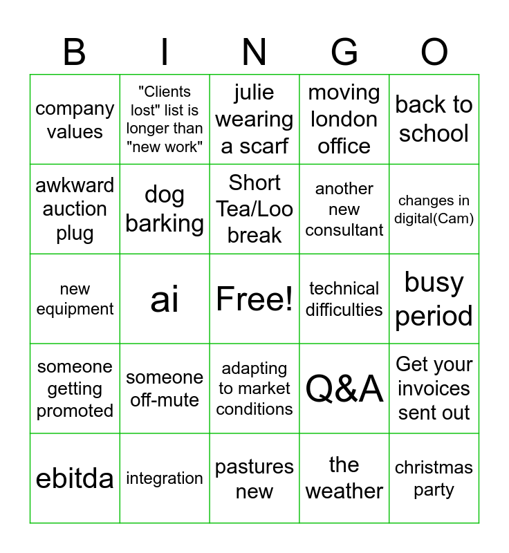 This bingo card has a free space and 29 words: ebitda, financial struggles, ai, redundancies, company values, julie wearing a scarf, dog barking, someone off-mute, technical difficulties, integration, busy period, christmas party, pastures new, the weather, changes in digital(Cam), AR print requirements, adapting to market conditions, someone getting promoted, back to school, new equipment, Q&A, stupid icebreaker activity, another new consultant, awkward auction plug, moving london office, "Clients lost" list is longer than "new work", Get your invoices sent out, Short Tea/Loo break and Workiva.